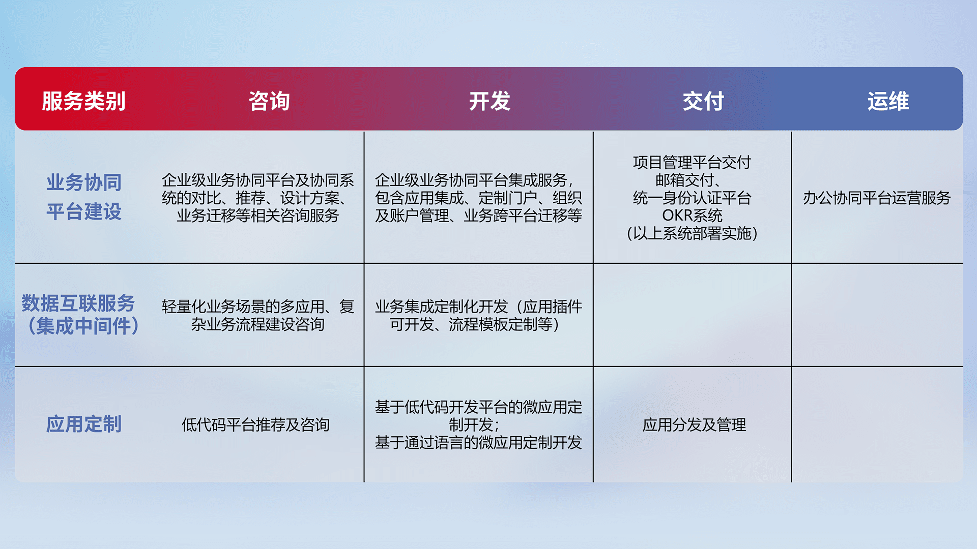 针对钉钉、、企微、、、IDaas等平台级产品提供产品的规划、、、方案、、、交付、、定制化开发等服务,,,实现如统一协同办公、、、、智能客户服务、、、、混合会议管理、、、智能数据查询、、、、等业务场景,,实现数字化转型。。。。