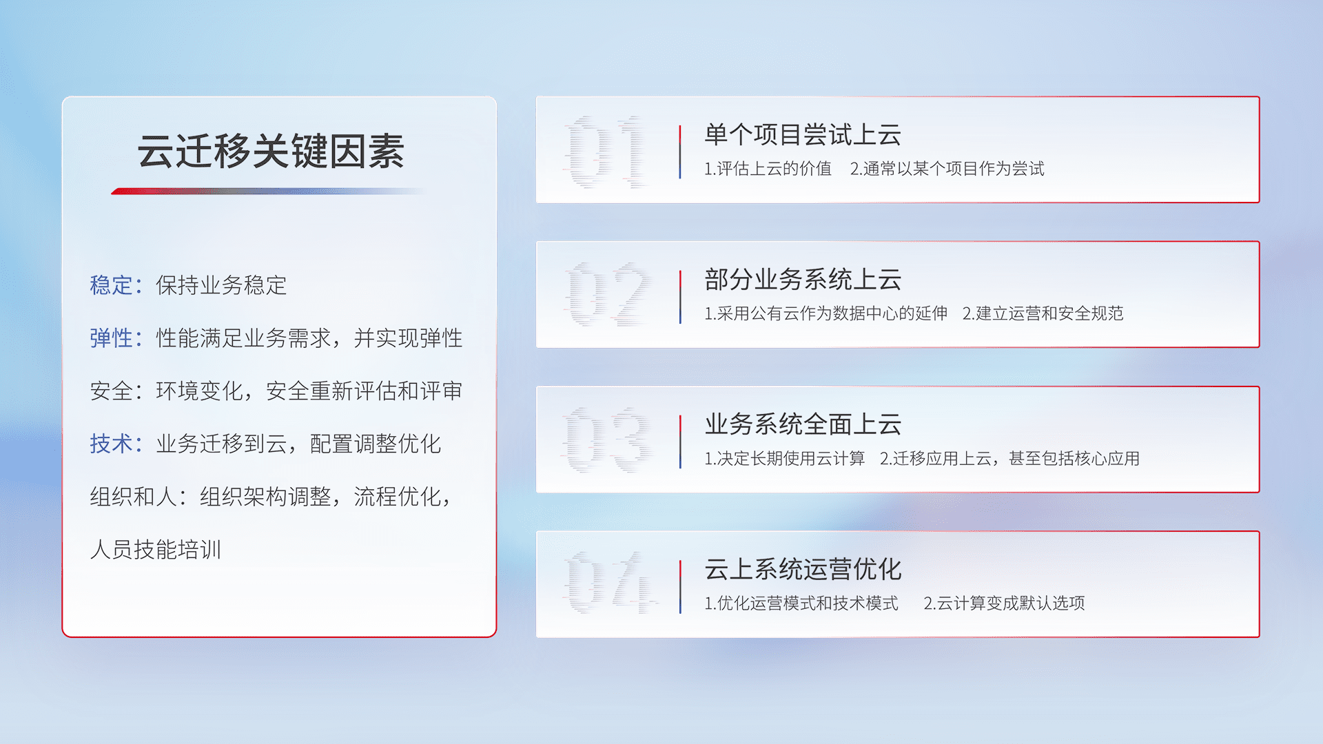 结合实际业务,,从规划设计、、、、云平台选型、、、、云原生改造、、、、数据迁移、、集成交付,,,,迁移全过程为客户识别最佳上云路径,,做好风险识别管理,,,设计网络架构、、身份权限、、安全审计合规、、、、操作审计、、、、日志审计、、监控告警策略、、、多站点容灾设计等,,,,对云上基础设施进行整体规划,,,提升IT治理水平,,,以满足弹性、、、、高可用、、高性能的需求。。