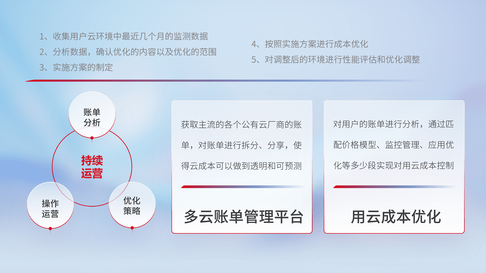 通过多云纳管,,以统一的资源数据模型把客户的云资源进行抽象和封装,,进而实现对多云资源的统一操作,,,保障云资源管理的可靠性、、稳定性与可用性。。。量身定制化运维内容,,,配置、、、开发运维、、、补丁管理、、备份、、监控、、、认证和访问管理、、审计和日常巡检等,,,,保障在用云过程中的可靠度,,,,稳定度以及高可用率。。。。